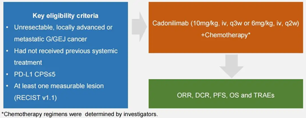 [1].Xu Q, Zhang L, Li J, et al.Cadonilimab plus chemotherapy as first-line (1L) treatment for metastatic gastric (G) or gastroesophageal junction adenocarcinoma (GEJA) with PD-L1 CPS≤5: Updated results from a real-world study. 2024 ESMO IO, Abstr 114P.