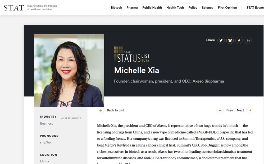 近期,国际著名生物医药行业媒体STAT重磅发布了全球科学生命领域《The 2025 STATUS List》(2025年领军人物榜单)。该榜单从全球医疗政策、生物技术、卫生技术、医学和卫生保健等领域,遴选了对塑造健康与科学生命未来全球最具有影响力的50位领军人物。