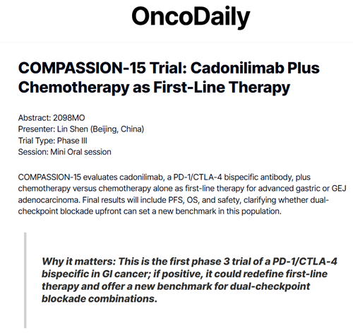 OncoDaily认为COMPASSION-15研究意义重大:“这是PD-1/CTLA-4双特异性抗体在胃肠道癌领域的首个III期临床试验。若结果持续,不仅可能重新定义一线治疗标准,更有望为双免疫检查点阻断联合方案树立新标杆。”
