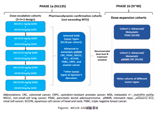 AK119-102是一项首次在标准治疗难治性晚期实体瘤患者中进行的多中心开放标签Ia/Ib期研究(NCT04572152)。主要目标是评估安全性、耐受性和剂量限制毒性(DLT), 并确定AK119联合AK104的最大耐受剂量(MTD)或最大给药剂量(MAD); 次要目的是评价抗肿瘤活性、PK和AK119免疫原性。剂量递增阶段将评估AK119(1 mg/kg 至 40 mg /kg Q2W IV)与AK104 Q2W IV(6mg/kg)联合使用的5个剂量水平,采用3+3+3研究设计(Figure1)。