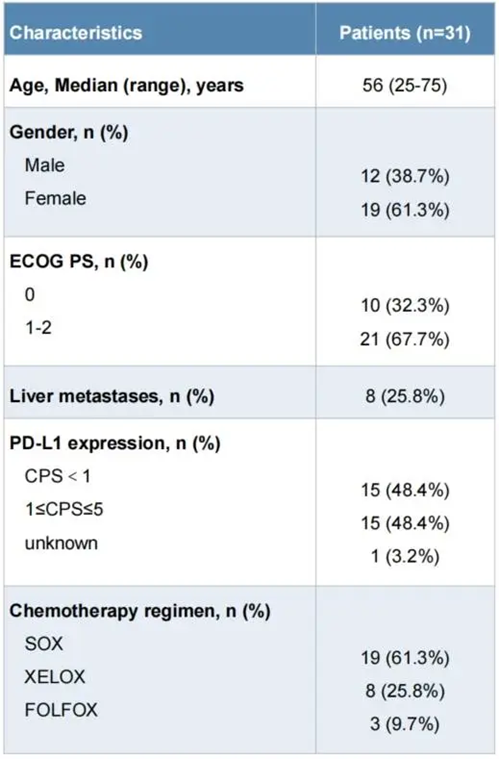 截至2024年8月24日,共入组31例患者。基线时中位年龄为56.0岁(范围:25岁-75岁),67.7%为ECOG PS 1/2,48.4%为PD-L1 CPS<1(表1)。4例患者在MDT指导下接受手术治疗,其中3例PD-L1 CPS<1。所有患者的安全性和有效性均可评估。17例达到部分缓解(PR),14例达到疾病稳定(SD)。总体ORR为54.8%,DCR为100.0%(表2)。中位PFS为7.38个月(95% Cl:5.55-9.21),中位OS为14.26个月(95% Cl:11.08-17.44)(图2)。PD-L1 CPS<1组ORR为53.3%(8/15),DCR为100.0%(15/15),中位PFS为9.25个月(95% Cl:0.00~20.09),中位OS为14.26个月(95% Cl:7.78~20.74)(图2)。肝转移患者(25.8%,8/31)的ORR(8例PR,100%)高于总体ORR(54.8%)(表1)。67.7%的患者出现TRAE,其中3级TRAE占9.7%(中性粒细胞减少6.5%,血小板减少3.2%,糖尿病3.2%)。未发生4/5级毒性。