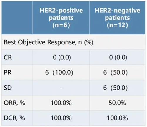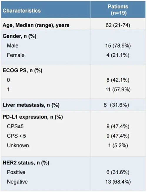截至2024年9月24日,共入组19例患者,其中13例(68.4%)为HER2阴性,6例(31.6%)为HER2阳性。中位年龄为62.0岁(范围:21岁-74岁),8例(42.1%)为PD-L1 CPS<5且HER2阴性(表3)。HER2阴性患者中1例未进行基线后肿瘤评估。HER2阳性患者中,6例达到PR,ORR和DCR均为100.0%;HER2阴性患者中,6例PR,6例SD,ORR为50.0%(6/12),DCR为100.0%(12/12);对于HER2阳性人群,不限PD-L1表达,ORR达100%;HER2阴性且PD-L1 CPS<1的患者中,ORR为57.1%(4/7),DCR为100.0%(7/7)(表4)。中位PFS和OS尚未成熟。3例患者(15.0%)出现3级TRAE,无4/5级TRAE发生。