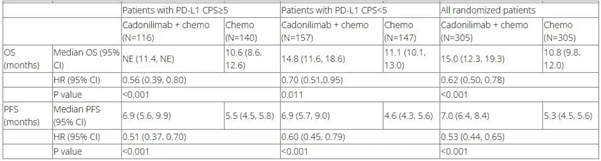 [3].Ji J, Shen L, Li Z, et al.Cadonilimab plus chemotherapy versus chemotherapy as first-line treatment for unresectable locally advanced or metastatic gastric or gastroesophageal junction (G/GEJ) adenocarcinoma (COMPASSION-15): A randomized, double-blind, phase 3 trial. 2024 AACR, Abstr CT006.
